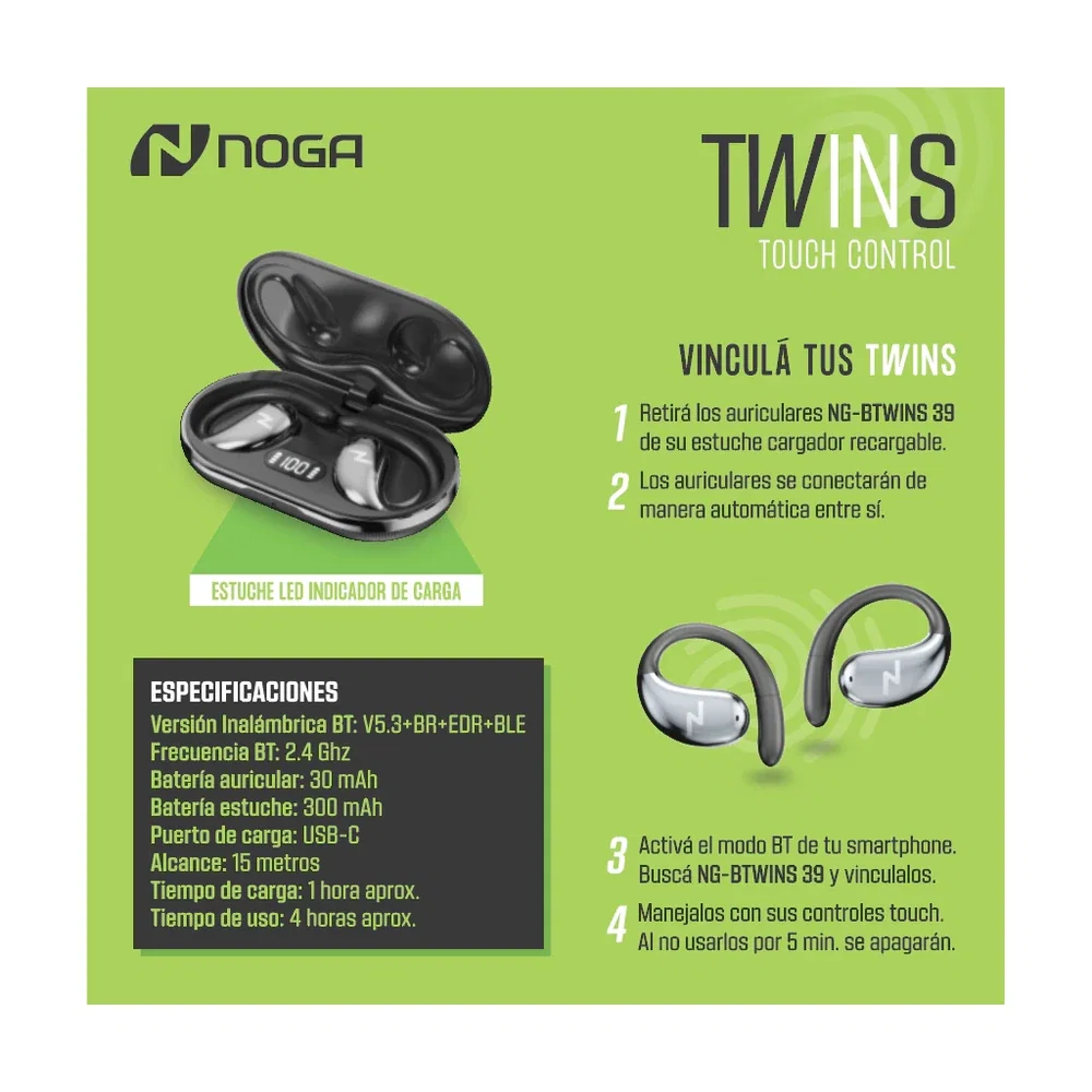 Los Auriculares Inal谩mbricos NG-BTWINS 39 est谩n pensados para quienes necesitan comodidad, estabilidad y sonido potente en cada movimiento. Su dise帽o sport con ganchos alrededor de la oreja asegura un ajuste firme, ideal para entrenamientos, running o actividades al aire libre.